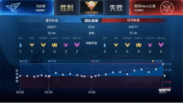双方和平开局,2分32秒RW侠拿下第一条暴君,4分54秒上路团南京Hero娜可露露拿下双杀,中路RW侠击杀盾山。5分20秒南京Hero拆掉RW侠上路一塔,6分50秒下路团南京Hero打出1换3,8分04秒RW侠击杀先知主宰。9分35秒中路团RW侠打出1换3,拆掉南京Hero中路一塔,10分16秒RW侠击杀黑暗暴君。12分28秒主宰团南京Hero抢下主宰,双方2换2。13分40秒中路团,RW侠打出1换4,拆掉南京Hero下路二塔。16分40秒RW侠击杀盾山,17分40秒RW侠拆掉南京Hero上路高地,南京Hero打出0换2。19分50秒RW侠再拿黑暗暴君,20分50秒上路团RW侠打出0换4,南京Hero仅剩一人无力防守,RW侠一波拆掉水晶。