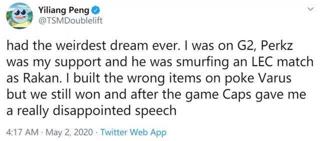 “昨晚做了个有史以来最奇怪的梦。我在G2,Perkz是我的辅助。在一场LEC比赛中,他使用洛并发挥出色,而我玩的是Poke流韦鲁斯而且买错了装备,但是我们还是赢了。比赛结束后,Caps在我面前进行了一次非常失望的演讲。”