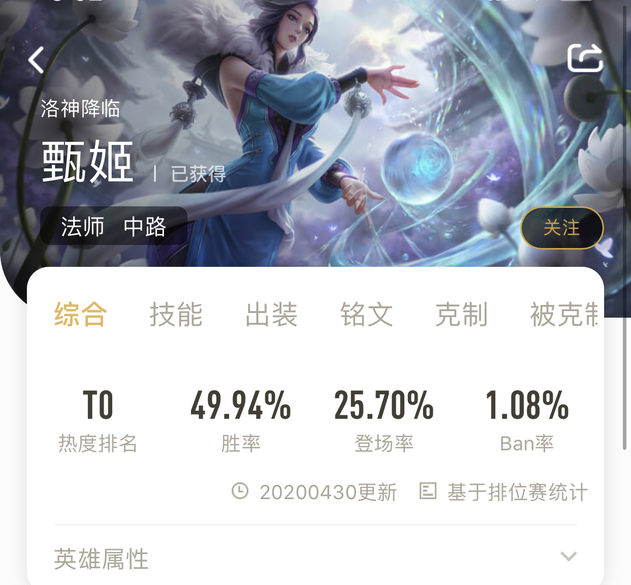 在王者荣耀官方即时统计数据中,甄姬的出场率为25.7%位于热度排行梯队的T0级别,这也足以证明了甄姬的实力是非常的强的。但是其胜率却只有49.94%,胜率只有不到50%。这也证明了我们之前的观点操作上限高的问题,敌人手上秀来飞起,队友手上空完技能就只有回泉水洗澡。