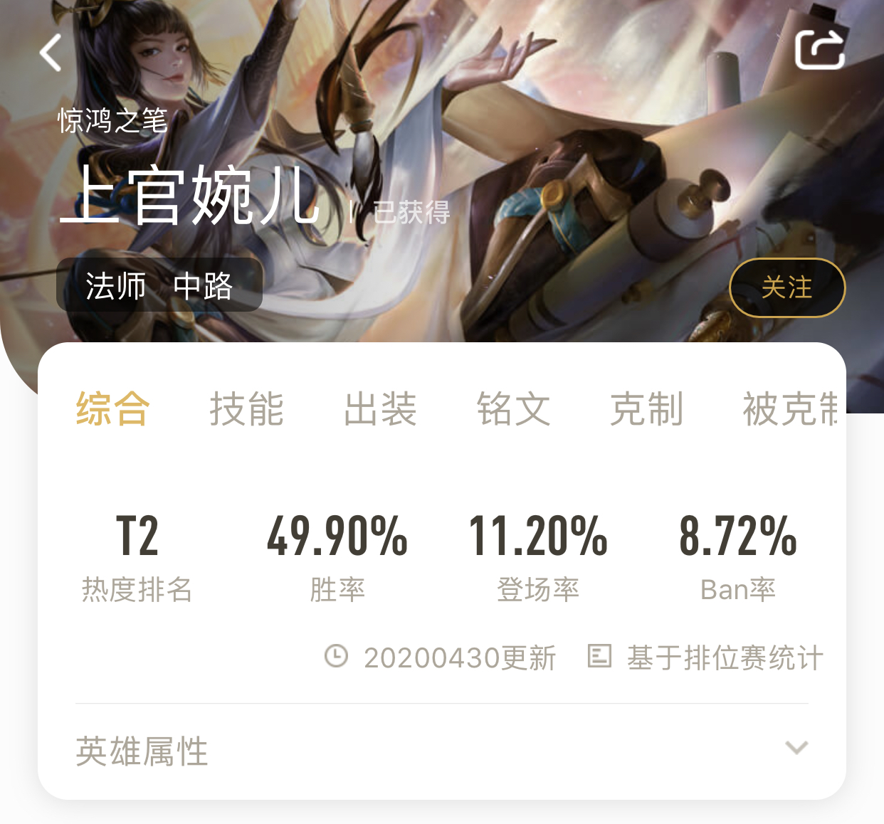 上官婉儿的全服出场率为11.2%,总体来说这个上场率还是可以的,ban率高达8.72%,这也是因为上官婉儿在前几个版本的统治力太强所导致的。这也证明了上官婉儿即使被削了无数次,但是操作起来依然可以强势。胜率呢,跟前两位英雄一样都不是很高,仅仅只有49.9%还是接近50%了。这点还是证明了上官婉儿的上限高的关键点。