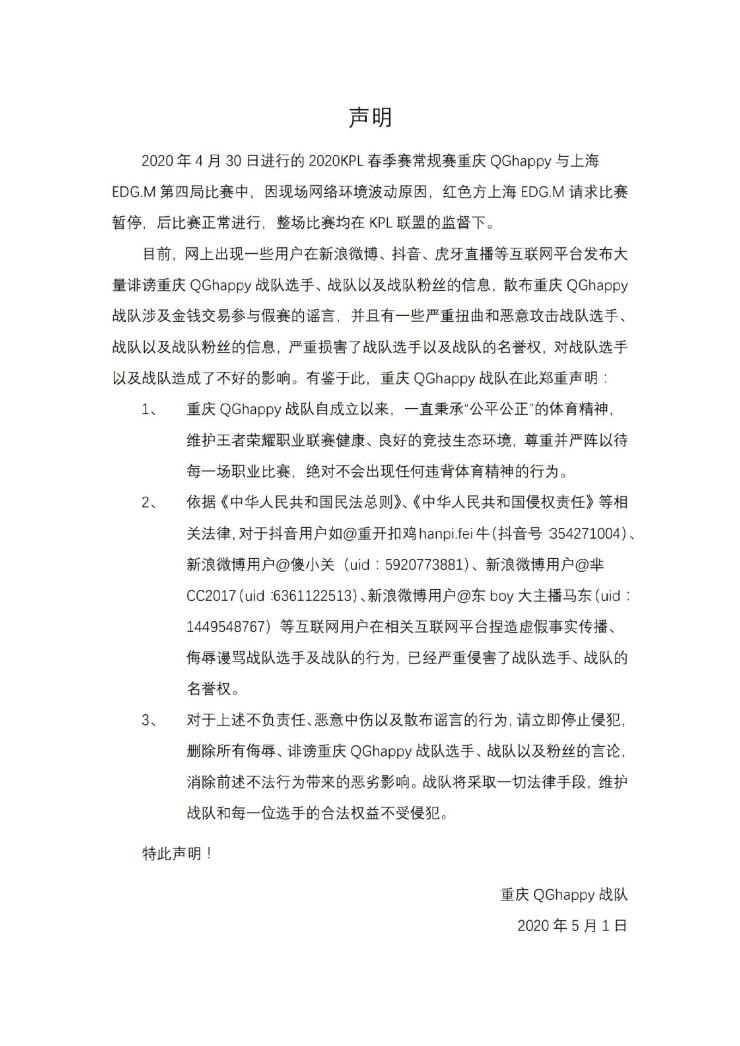 在五月一日,QG进行了声明,并解释了整个事情经过,这一切都是有KPL监管部门监督的,并公布了一些“黑粉”ID,责令删除一些言论,并打算使用法律手段维护自己的队员,追求相关者的法律责任!(真以为网上可以随意散布谣言?)游戏网