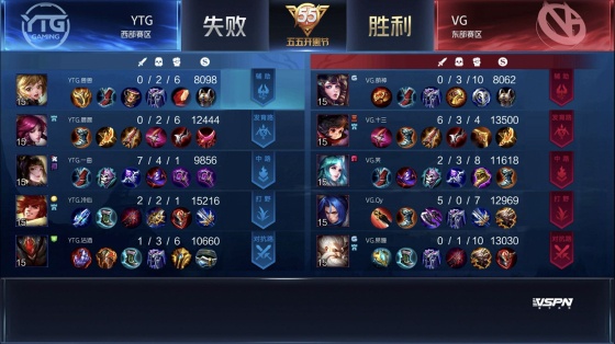 15分54秒,易瞳抢下黑暗暴君,双方辅助一换一,17分钟,VG四人越塔抓死沽酒关羽,17分半,VG用两个人头换掉YTG下路高地,18分28秒,成吉思汗拿下主宰,站撸击杀十三马可波罗,20分46秒,马可波罗三连决胜,YTG被团灭,VG三人带穿中路,复活的兰陵王来不及清理兵线,VG推掉敌方水晶,先下一城。本局最佳给到VG.十三的马可波罗