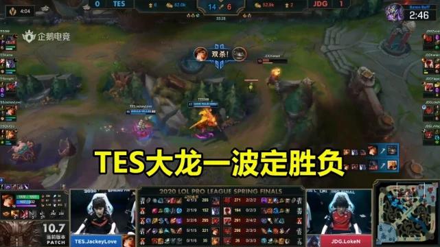 随后双方进入长达五分钟的拉扯,先是TES偷龙无果,JDG这边也是尝试偷龙,双方不断的在进行心理博弈。最后在33分钟,JDG在主动打大龙的情况下,被TES占据更好的位置,成功接盘,拿下大龙的同时还赢下了团战,最终一波赢下比赛,成功扳回一局。