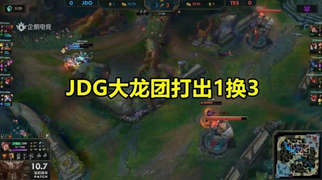 11分钟,Knight丽桑卓TP去上,抓死了Zoom的奥恩,369收到人头,JDG止损拿下二条小龙土龙。16分钟,双方争夺第三条小龙水龙,但是卡萨盲僧被牙膏妖姬偷残,JDG顺利控下第三条小龙。21分钟,TES再次实施偷大龙战术,但是JDG嗅觉灵敏,五人集结过来,JDG追击TES众人,打出一波1换3。