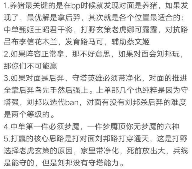 那么要如何才能克制养猪呢?克制养猪流最重要的一点就是阵容,在对面直接ban甄姬的时候建议一抢后羿,毕竟后羿这个英雄即使不是养猪也有作用,但养猪阵容缺少了后羿就不行,中单王昭君干将最优。如果没有发现对面是养猪而正常拿阵容,那基本上已经输了一大半,还有中单出梦魇、守塔英雄带净化等等小细节。总之,对抗养猪最重要的还是阵容,会玩的甄姬王昭君就是胜利的关键。