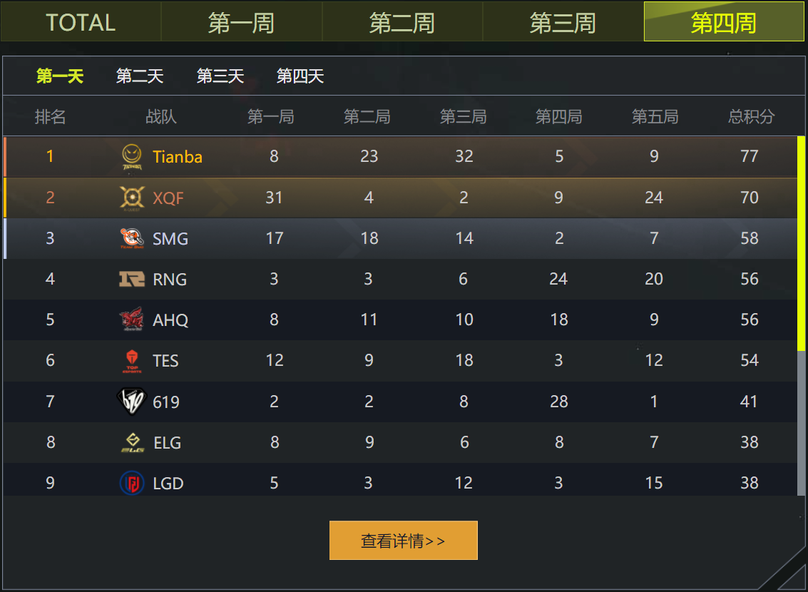 事实上,目前位列第一的TianBa战队在第三周就以187分的周积分位列榜首。而在第四周的首日比赛中,虽然第一场比赛因为判断失误导致过早退出比赛,但他们很快找回状态,凭借精准的判断和极强的行动力,在第二局和第三局中分别豪夺23分和32分,以77分的绝对优势占据首日榜首。