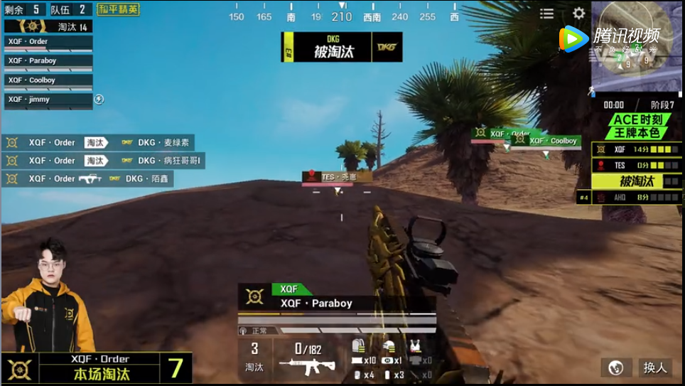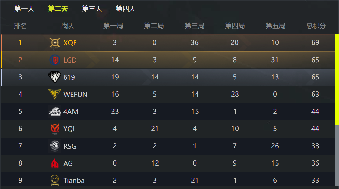 老牌强队XQF则表现抢眼,在第四周首场比赛中,当DKG和TES正在圈边胶着之时,XQF.Order则从后方突围,一波压枪迅速收掉DKG的三人,以单场淘汰7人的强大实力让解说为之欢呼。而当TES的尧崽还在圈边苦苦挣扎之时,Paraboy一次漂亮的双杀让XQF获得了15个淘汰的绝对优势,也为团队取得了31分的成绩。
