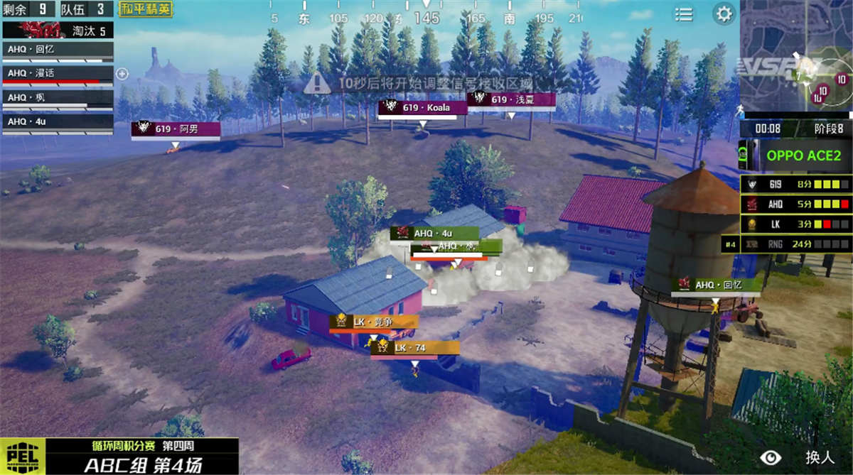 值得一提的是,619战队在首日状态也有所回升,在第四场比赛中,先是于LGD正面一次刚枪,占据优势轻松将其淘汰,抢占到了麦田圈制高点,并将淘汰9人的RNG牢牢控制在圈边;同时,当AHQ与LK在房区胶着之时,619又以一次教科书般的高打低战术夺得第四场比赛的胜利。