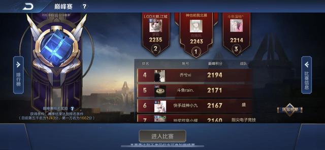 北慕以巅峰积分2243分,以8分的优势力压KPL战队LGD大鹅的超强新人江城,重返巅峰赛第一!上到巅峰赛第一之后,北慕增强了挑战的难度,要将另外的一个账号打上巅峰赛第二名,从而一个人霸榜巅峰赛前两名。