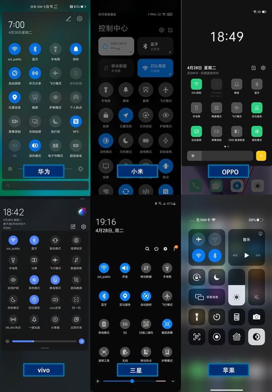 下拉菜单部分,这几款手机都做到了不同程度的优化适配,整体色调比较舒适,在图标背景和说明文字部分都进行了一定程度上的“深色调整”,整体来说,在深色模式中的设计中,几大品牌的UI优化在这一块是最为出色的。分别来看,华为和苹果的深色模式只是在原本的状态下调整了色彩的明度,而另外几款手机是大面积的暗色纯色铺就,至于具体哪个更好还是看个人喜好。