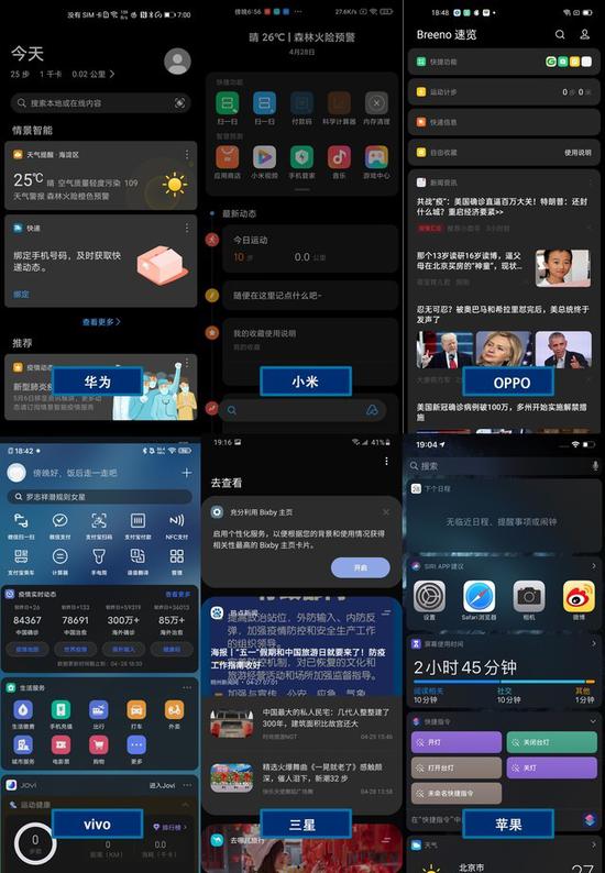 在桌面负一屏部分,iOS 13和MIUI 12的设置给人的观感更加舒适,能够针对壁纸和内容进行适配调色,让夜间打开也不会出现不适的情况。不过综合来看,vivo和苹果的深色模式是真的加入了“深色”元素,整体还是彩色色调的,其他几款则是将背景直接换成了黑色或者暗色;小米的色调在这几款中看起来颜色是最深的。