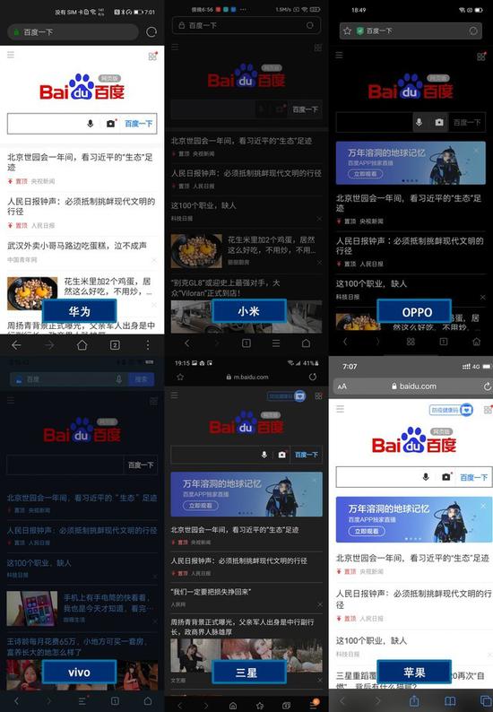 在其它白底背景页面中选择了浏览器来进行对比。在文字显示部分我们可以看到,表现比较出色的是小米和三星,深色模式在背景和文字显示上配色更加协调,不只是单纯的“黑白配”,通过降低色彩纯度和对比度来达到更佳的视觉体验。vivo在浏览器适配深色模式时,并没有选择前面的黑白配色,而是选择了深蓝色的搭配,整体看起来还是比较适合夜间使用的。
