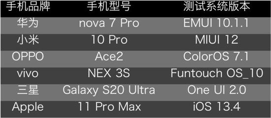 在品牌选择上,我们选择了主流的六大品牌华为、小米、OPPO、vivo、三星和苹果,出战的手机分别为华为nova 7 Pro、小米10 Pro、OPPO Ace2、vivo NEX 3S、三星Galaxy S20 Ultra和iPhone 11 Pro Max。六台手机的系统见下表: