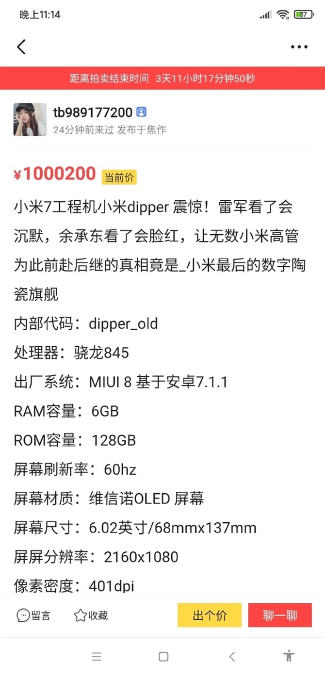 不过呢,未发布不能代表它就不存在。近期就有一款号称小米7的工程版本出现在闲鱼上,售价更是高达100万元以上,为了让用户信服,该卖家还上传了多张小米7工程机的真机照。