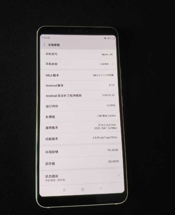 从图片上看,这款小米7工程机的代号为dipper,出厂系统基于安卓7.1.1的MIUI8,不过已升级成基于安卓8.1的MIUI9开发版了。核心配置上,该机采用骁龙845处理器,具备6GB+128GB的内存组合。特别的是,该机正面采用一块18:9的全面屏,金属边框设计,机身背部则采用陶瓷材料。