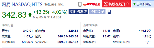 5月5日晚间消息,网易开盘涨3.7%,报342.08美元。截止发稿,涨4.02%,报342.83美元。