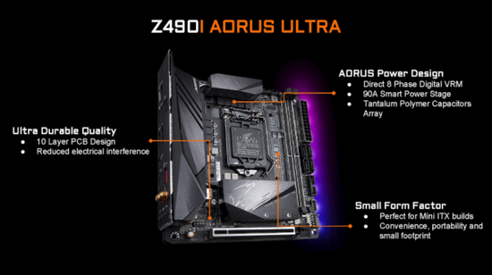 值得一提是技嘉还准备一款Z490I AORUS ULTRA的迷你型主板,专为HTPC用户量身打造。别看它体积小巧,仅有ITX规格,但是依旧具备90A单项供电能力与10层PCB的强悍用料。实事求是的说,这将是有史以来最高规格的ITX主板之一,配合水冷散热系统,玩家将更容易打造集成超高性能的迷你主机平台,实现真正意义上的个性化PC。