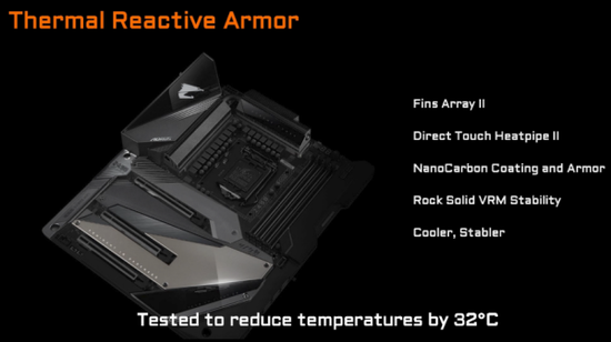 技嘉AORUS Z490不仅供电用料扎实,在主板的散热控制上同样下足了功夫。为此技嘉开发Fins Array第二代散热装甲与纳米碳涂层辅助散热,不仅外观更加酷炫,质感十足,在面对16相90A供电输出时候的温度表现更加令人惊讶:相比普通主板,整体的主板散热模组的温度足足降低32°,触手可及的低温体验。毫无疑问这将为CPU超频提供了极大的可靠性,系统运行更加流畅稳定。