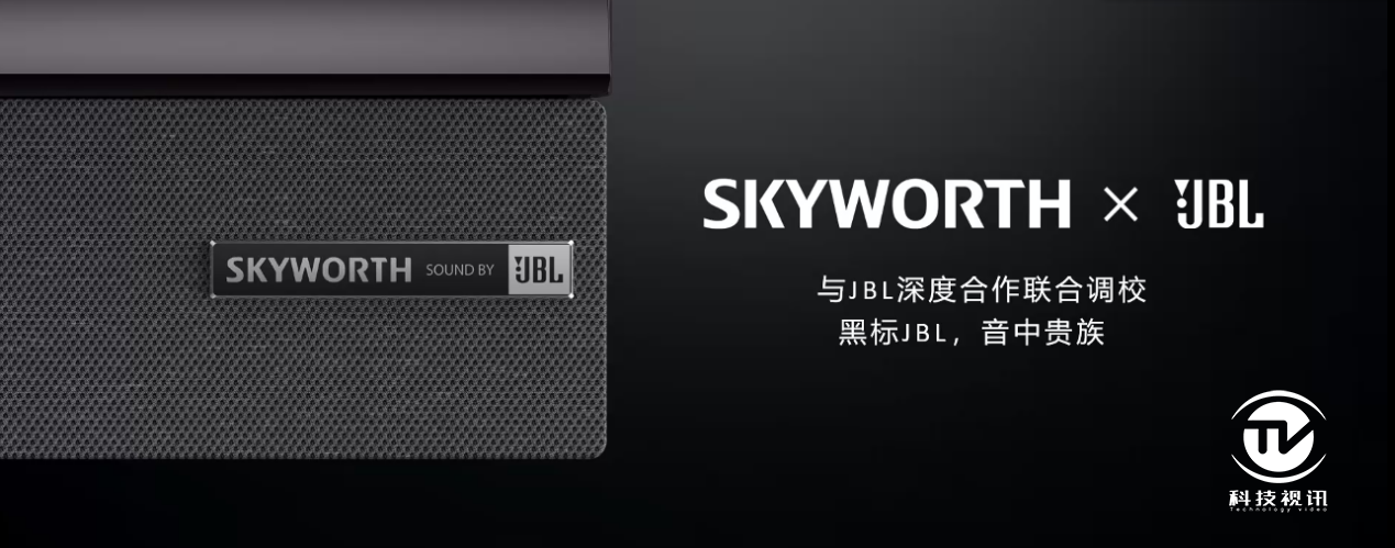 电视集成了JBL专业级前出音响,其前出喇叭设计能够营造沉浸式的音画体验。屏幕右下角的“SKYWORTH SOUND BY JBL”标志非常鲜明,表明这款电视采用了黑标JBL音响,并且这款电视的音效已经和JBL进行了深度合作联合调校,为用户带来更加专业的音质享受。