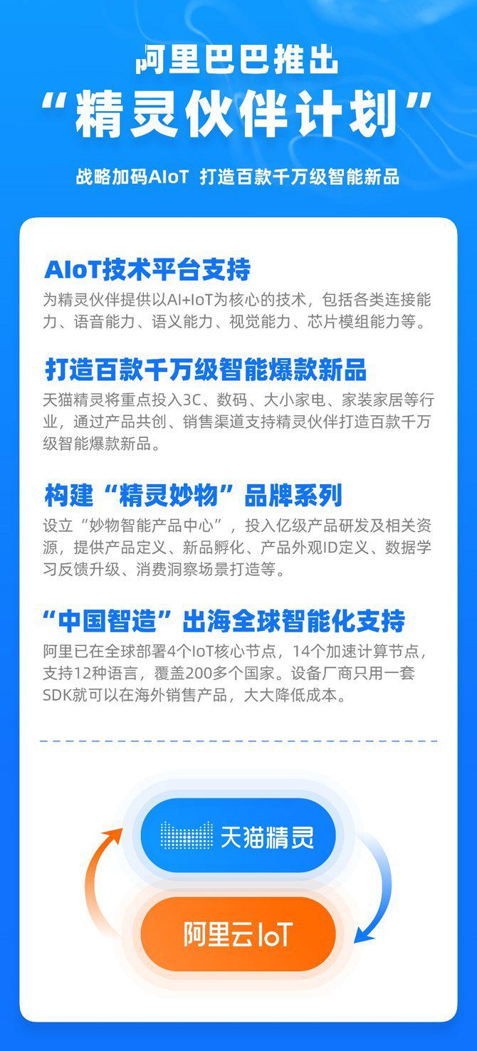此次阿里又乘胜追击,开启的“精灵伙伴计划"为合作伙伴提供了四项帮扶措施。分别是提供AIoT技术平台支持、合力打造千万级智能爆款新品、构建“精灵妙物”品牌系列以及“中国智造”出海全球智能化支持。这几乎从最初的产品定义到最后的渠道宣发的每个关键环节都向传统制造商提供了强有力的支持。
