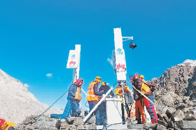 工程师们在珠穆朗玛峰上安装、调试基站。(华为技术有限公司供图)