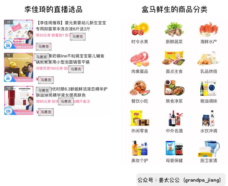 代表玩家李佳琦、盒马。李佳琦直播间里的商品和盒马售卖的商品品类非常相似,休闲零食、美妆个护、水饮冲调、粮油调味、母婴保健……大部分都属于标品。