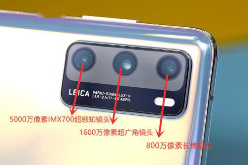 华为P40拥有204800 ISO感光范围,搭配多光谱色温传感器。后置超感知徕卡三摄,包括5000万像素IMX700超感知主摄(F1.9/广角)、1600万像素超广角镜头(F2.2)、800万像素长焦镜头(F2.4/OIS光学防抖),支持3倍光学变焦、5倍混合变焦、30倍数字变焦。