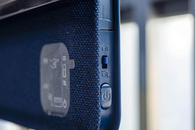 机身的背面设计相当简洁,和音箱网布颜色相近的蓝色色调设计,中间底部位置有一块可拆卸的盖板,主要的接口都被隐藏在内部,让整体的观感更具有一体性。