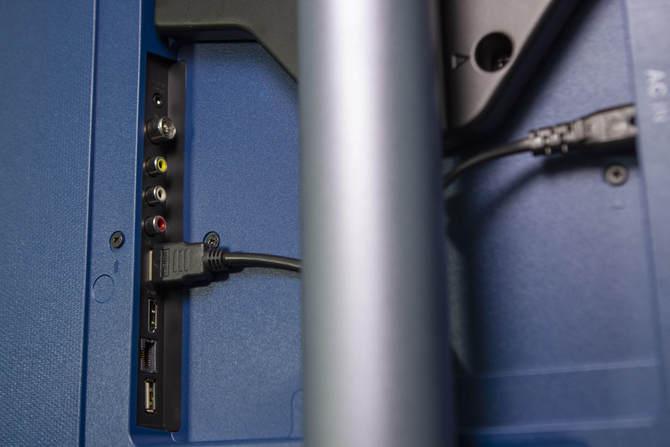 在音箱的右下角位置,设置了摄像头锁定键,如果锁定了摄像头就无法升起,可以更好的保护家庭的隐私安全。电视的电源按键也设置在该位置,同时底部还保留了一个USB-A接口,壁挂状态下想要接入U盘等会更方便。