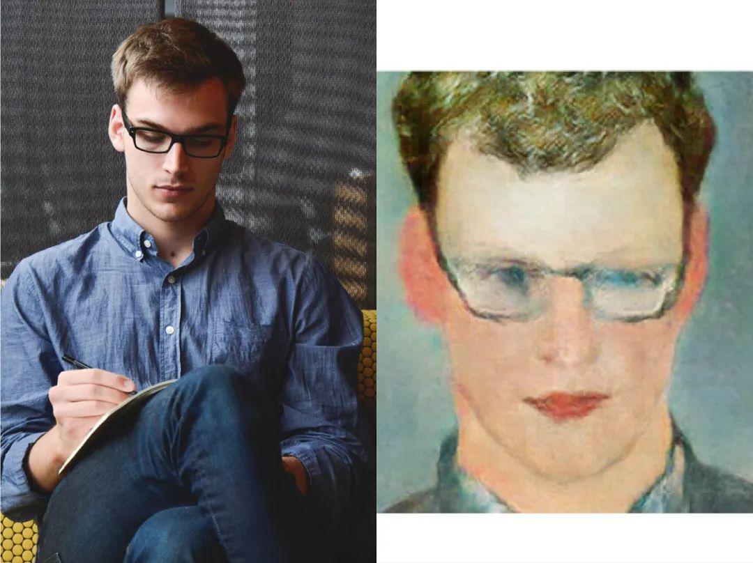 AI Gahaku 的生成效果。左图为输入,右图为输出的古典风格肖像画。