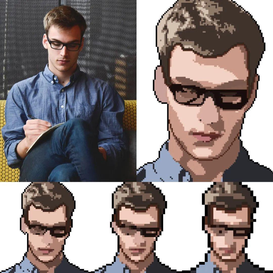 PixelMe 的图像转换效果。左上为输入图像,右上为 128x128 像素的生成结果,第二行分别为 64x64、48x48 和 32x32 像素的生成结果。