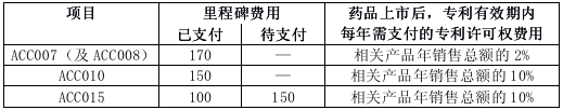 招股书显示,随着后续研发进度的推进及新药上市,艾迪药业将持续向Kainos支付后续里程碑费用和销售提成。ACC007(及ACC008)、ACC010、ACC015共需支付的里程碑费用分别为170万美元、150万美元、250万美元,药品上市后,专利有效期内每年需支付的专利许可权费用分别为相关产品年销售总额的2%、10%、10%。报告期内,该公司外购技术的里程碑款项和技术转让费分别为788.87万元、1336.07万元和100万元,合计2224.94万元,占到累计研发投入的13.82%。