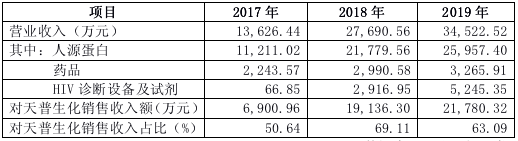 但该项业务收入主要依赖第一大客户广东天普生化医药股份有限公司(下称天普生化),报告期各期艾迪药业对天普生化的销售金额分别为0.69亿元、1.91亿元和2.18亿元,占各期营业收入的比重分别为50.64%、69.11%和63.09%。