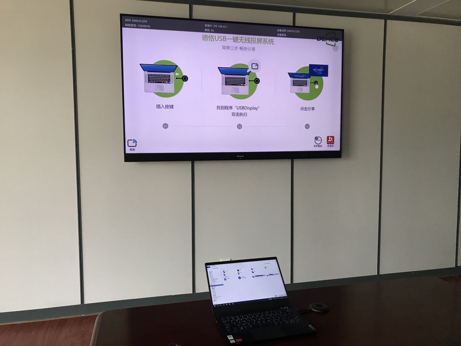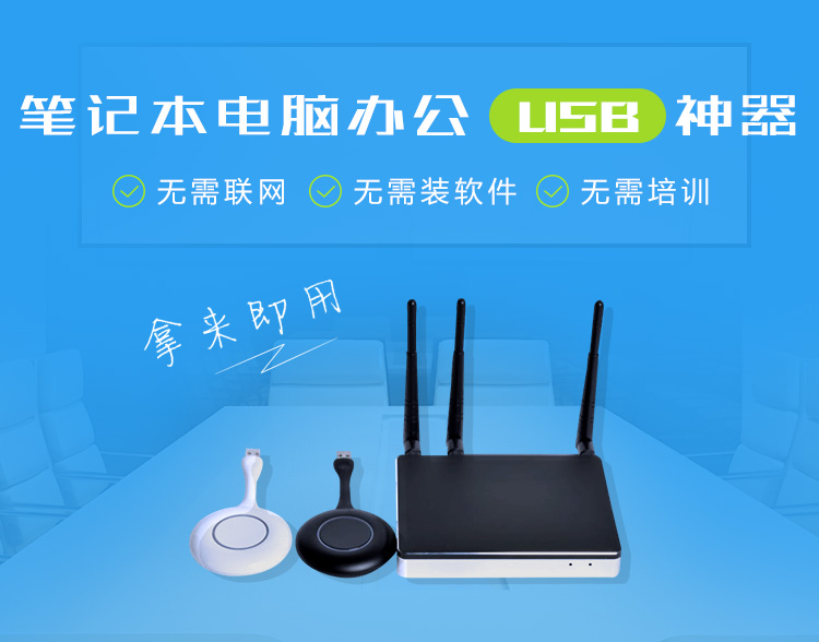 同时大家可以看到,笔记本电脑在会议室无线投屏的过程中,笔记本电脑与电视之间并没有连接信号线,而是在笔记本的USB接口插入了一支圆形状的按键,我们叫“USB投屏按键:只需简单三步即可完成无线投屏展示。