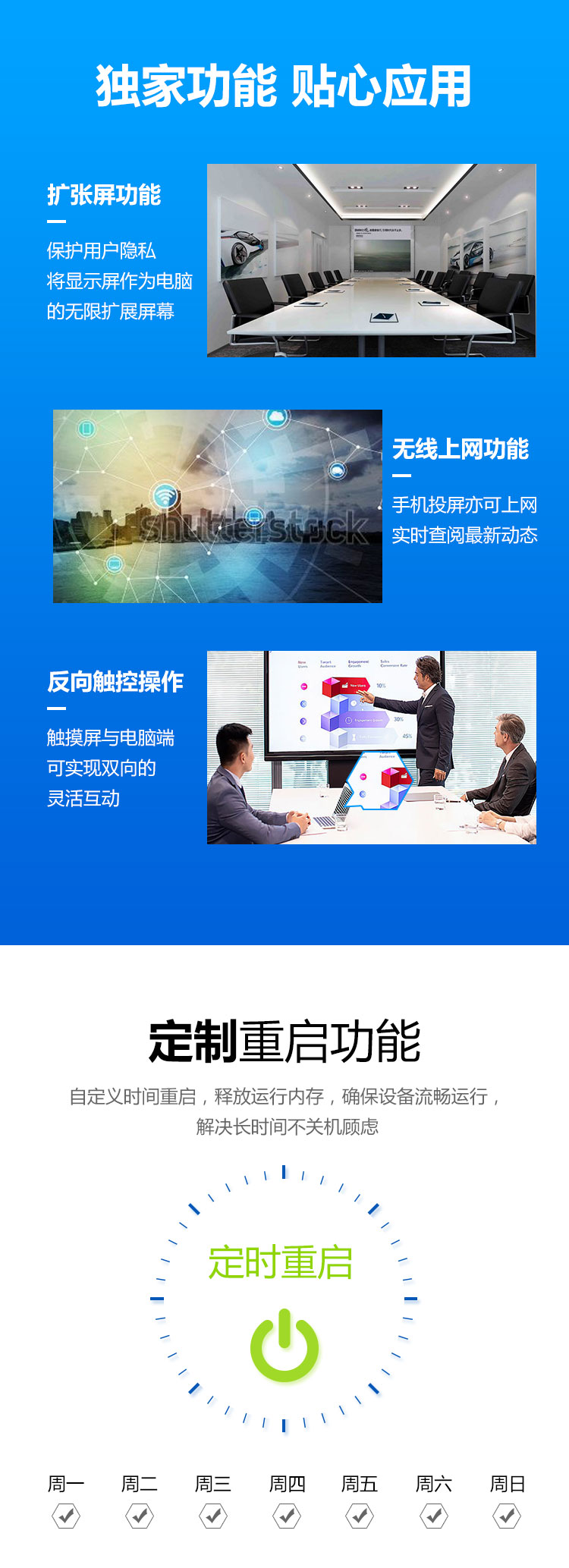 其中扩展屏的应用与定时开关机功能受到了很多用户的好评,如果您的会议室是采用的投影机,一般都是吊装在天花上的,投屏盒子如果是放在投影机旁边的话,每天还需要人为的开关机显得太繁琐,为了能让机器长时间的流畅运行,您只需设置投屏盒子的每天自动开关机时间,就能在保证稳定性的前提下,尽可能的延长机器使用的寿命。