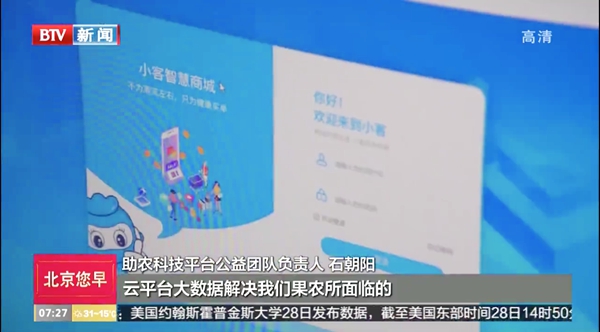 4月29日,北京卫视《北京您早》节目中报道,在这次疫情中,互联网平台释放出社会公益力量助推各行业复工复产。尤其点名小客科技通过大数据、云端销售、智慧化的生活平台等数字技术,搭建扶贫助农供销“连心桥”,多元化助力果农所面临的技术问题和销售方面的问题。