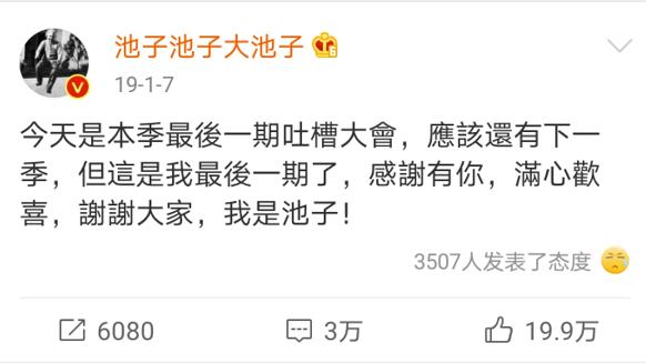 对于笑果文化来说,25岁的池子并不是一个“听话”的演员和艺人。1月6日,《吐槽大会》第三季收官。作为节目常驻嘉宾,1月7日凌晨,池子在微博发文宣布将退出《吐槽大会》,表示这将是他的最后一期节目。