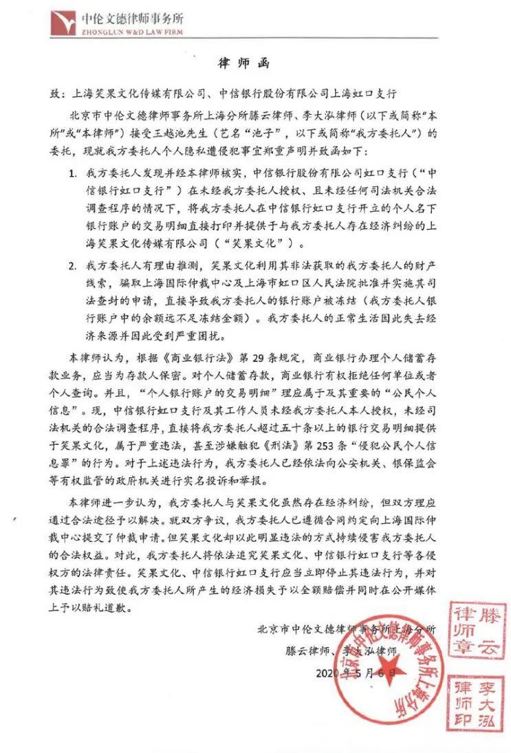 在微博长文吐槽之外,池子还晒出了中伦文德侓师事务所两名律师出具的律师函,向笑果文化和中信银行上海虹口支行发出声明。律师函显示,经委托人(指池子)发现并经律师证实,中信银行虹口支行在未经委托人授权、且未经任何司法机关合法调查程序的情况下,将委托人在中信银行虹口支行开立的个人名下银行账户的交易明细直接打印并提供于与委托人存在经济纠纷的笑果文化。