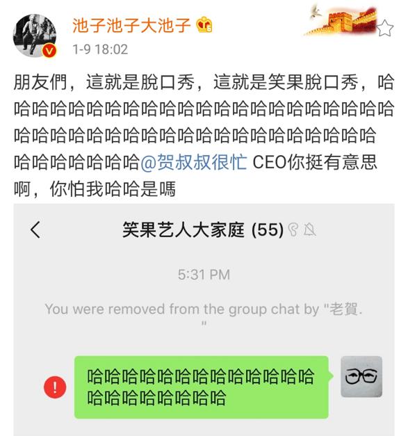此后,1月9日,池子在微博分享了一张自己被笑果文化CEO移出群聊的截图,不满之情溢于言表。