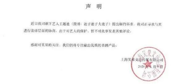 同日晚间,笑果文化联合创始人、CEO贺晓曦公布笑果文化官方声明:“近日我司旗下艺人王越池(池子)提出解约诉求,我司正寻求与其进行法律层面的协商。出于对艺人的保护,暂不对此事发表其他评论。”