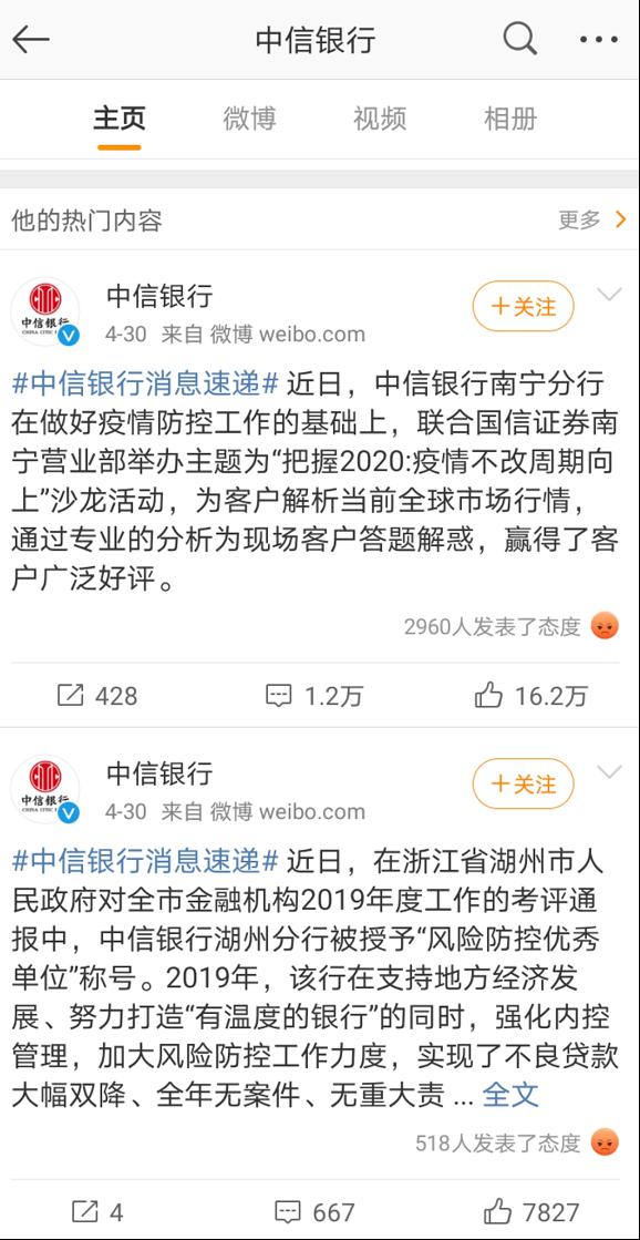 与此同时,中信银行的官方微博也已“沦陷”,其在4月30日发布的一条疫情相关微博留言数已达到1.2万,而平时的留言数量仅有几百甚至几十。网友们纷纷喊话中信银行,“我是大客户可以把其他人的余额提出来给我吗?”“什么样的大客户可以查别人信息!我定个小目标!”“大客户在哪里报名啊我也想报一个”……评论区一片哈哈哈之声,不过,目前中信银行尚未就网友评论给出回复。