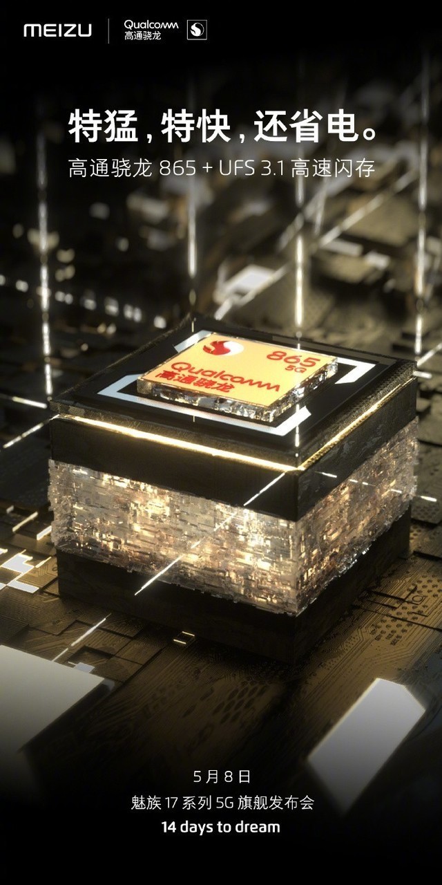 魅族科技定于5月8日在珠海举行新品发布会,推出5G旗舰魅族 17系列,根据官宣消息,魅族 17系列将会搭载骁龙865+X55移动平台,辅以UFS 3.1高速闪存,带来更加出色的性能体验。