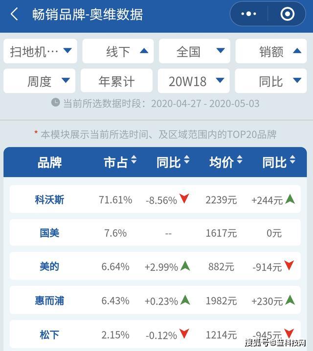 奥维罗盘2020年第18周(4.27-5.3日)线下渠道数据显示,在扫地机器人行业,科沃斯一骑绝尘,市场占有率为71.61%,尽管受疫情影响,同比下降8.56%,但均价为2239元,同比上升244元。