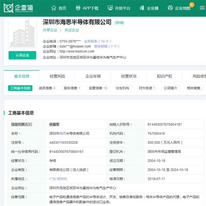 企查猫资料显示,海思半导体有限公司成立于2004年10月,法定代表人徐直军,前身是创建于1991年的华为集成电路设计中心。海思公司总部位于深圳,在北京、上海、美国硅谷和瑞典设有设计分部。