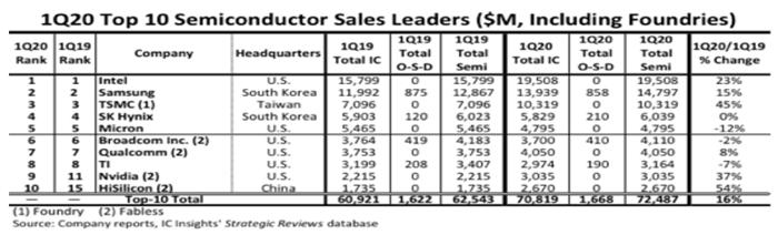 作为华为旗下的半导体公司,华为海思这些年在行业内的进步有目共睹。统计机构IC Insights公布的最新数据显示, 今年一季度,华为海思实现了54%的销售收入暴增,达到26.7亿美元,并因此首次进入全球半导体TOP10榜单。这不仅是华为的第一次,也是中企(严格来说是中国大陆企业)的第一次。