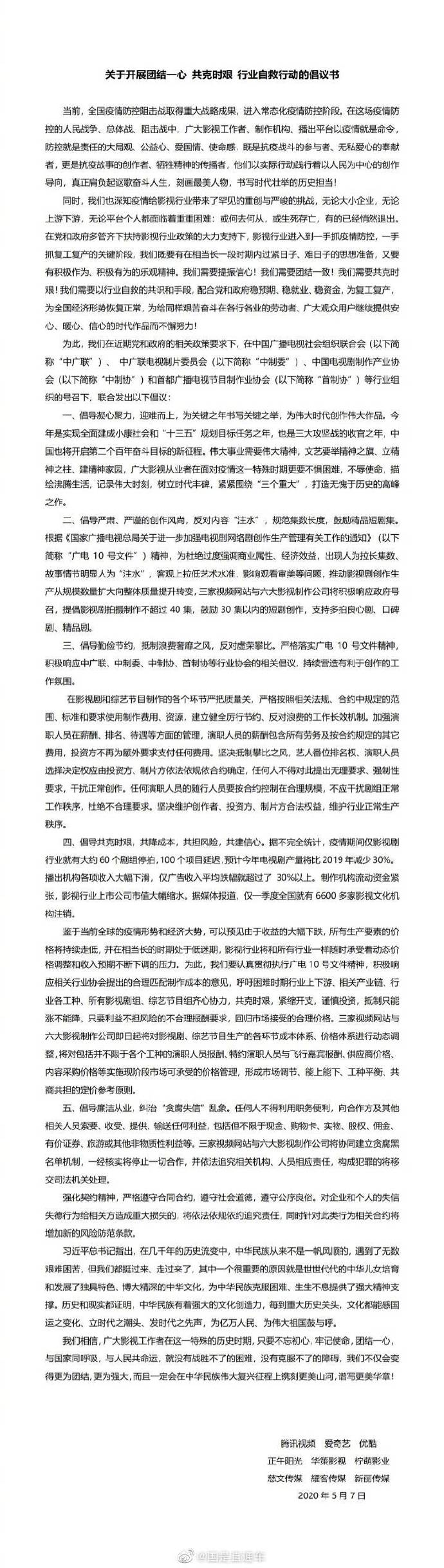 5月7日,腾讯视频、爱奇艺、优酷等9家影视公司联合发布《关于开展团结一心 共克时艰 行业自救行动的倡议书》,提出:影视行业要做好“在相当长一段时期内过紧日子、难日子的思想准备”,并倡导全行业“共克时艰,共降成本,共担风险,共建信心”。