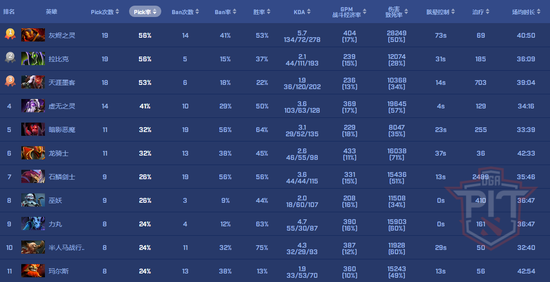 而火猫这个英雄当之无愧是这个版本的宠儿了,本次比赛火猫共计上场19次,BP率高达97%。另一个中单紫猫上场14次,BP率70%,也十分为各大战队所青睐。酱油英雄中,拉比克和天涯墨客分别上场19次和18次,神奇的是,拉比克的胜率只有37%,天涯墨客更是只有22%,看来在后续的赛事中,对这两个英雄的选择要好好思索一下了。