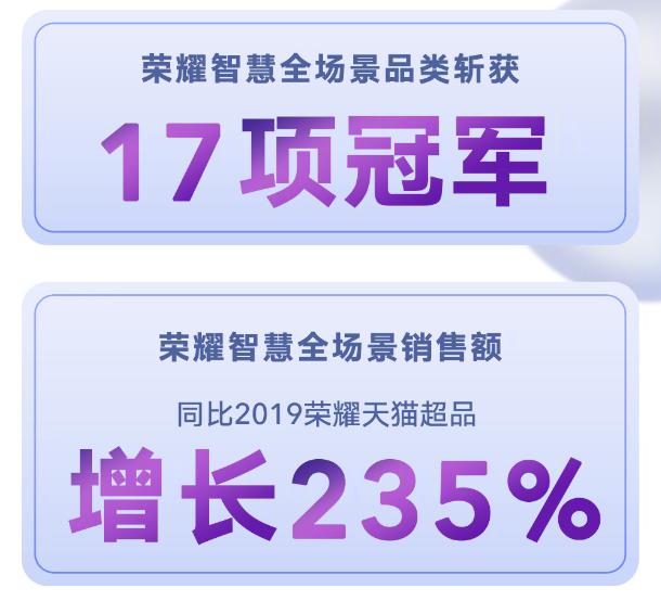 正因为此,荣耀IoT产品赢得了用户口碑和销售成绩的双丰收,在2020年荣耀天猫超级品牌日期间,荣耀全场景品类斩获17项冠军,相比2019年增长235%。