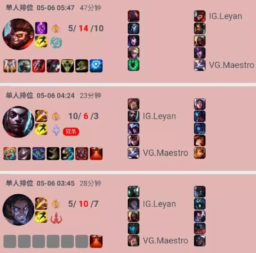 这不,最近有玩家发现,IG打野Leyan开始频繁地和VG辅助Maestro双排。不过这战绩看来并不理想,最近三局全败不说,乐言这三局下来死了整整30次!两人总共双排了得有四五十局。莫非Leyan即将转会至IG?