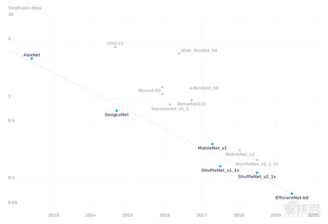 在前期调查期间,该公司发表了一份分析报告,指出与2012年相比,2019年的神经网络训练到AlexNet水准所需的计算量减少到原来的1/44,相比之下,摩尔定律在相同时间内效率的增长只有11倍。这表明算法效率在7年的时间里每16个月翻一番。